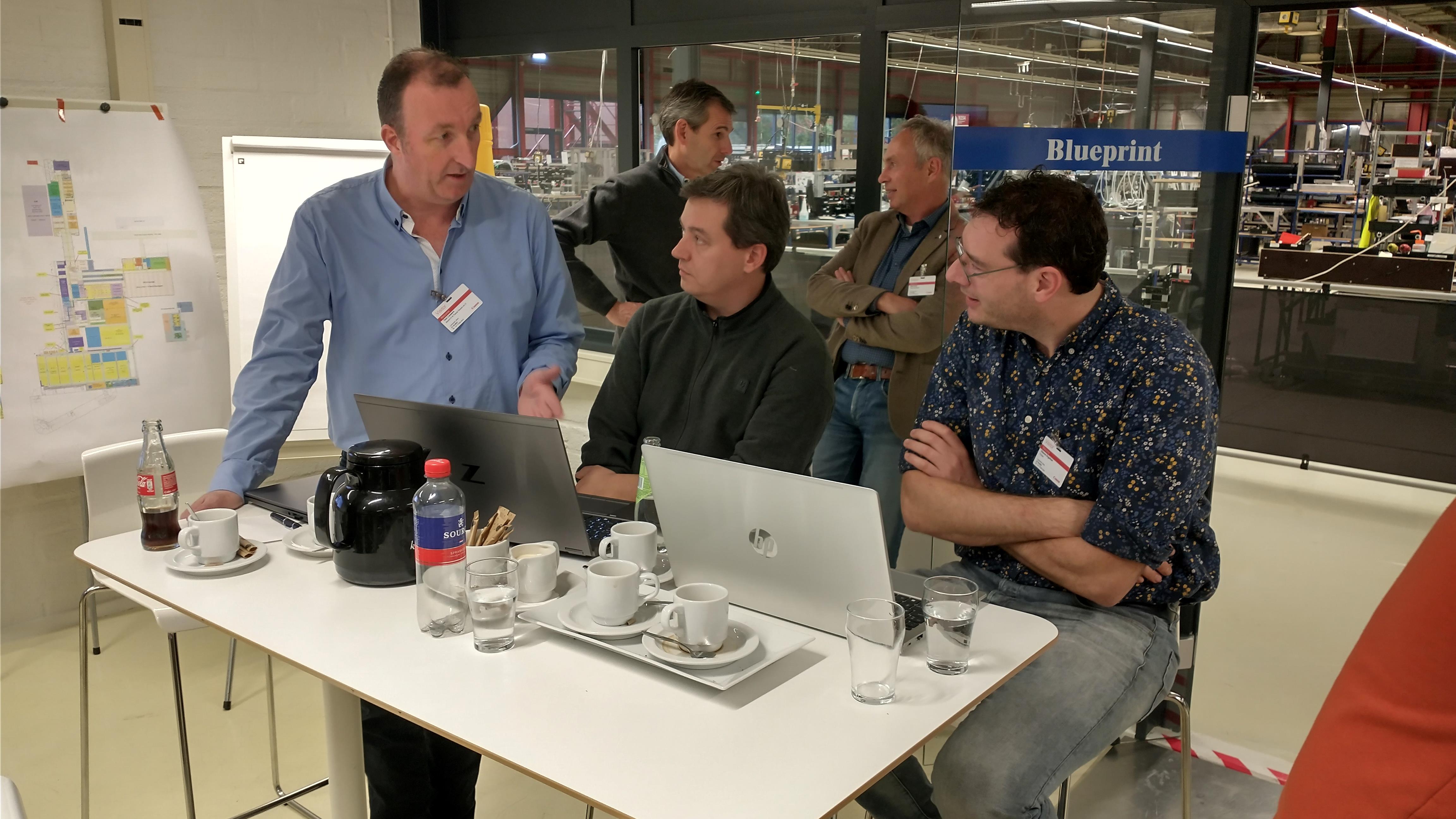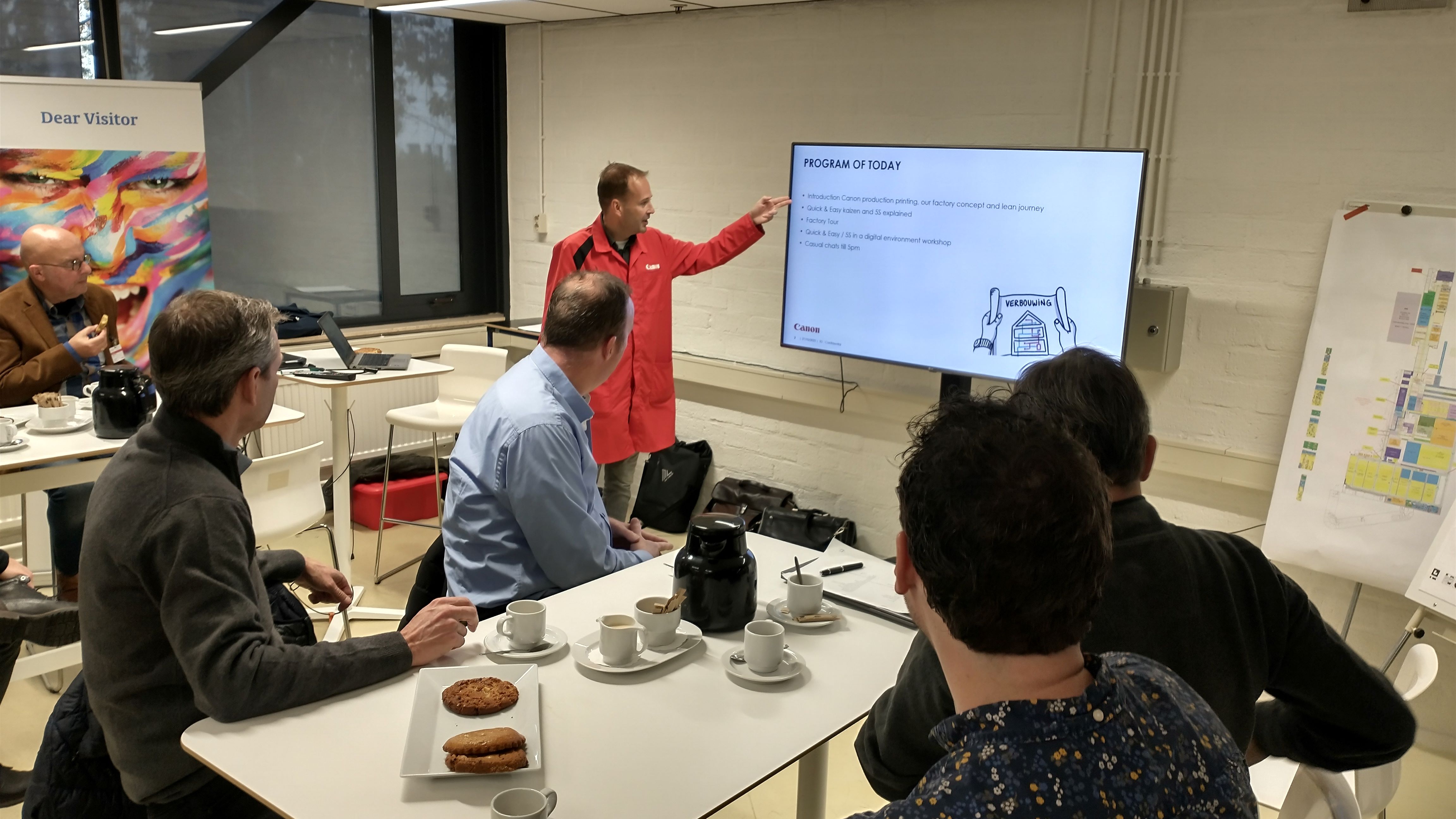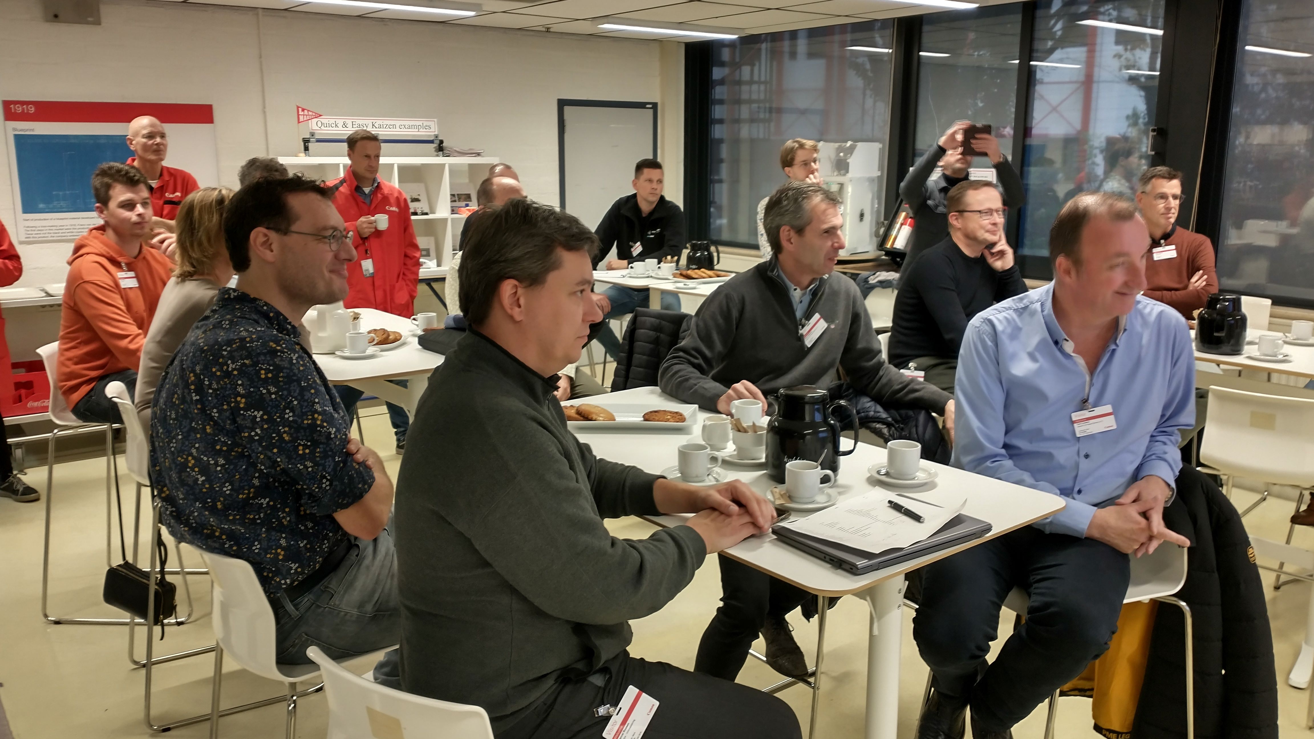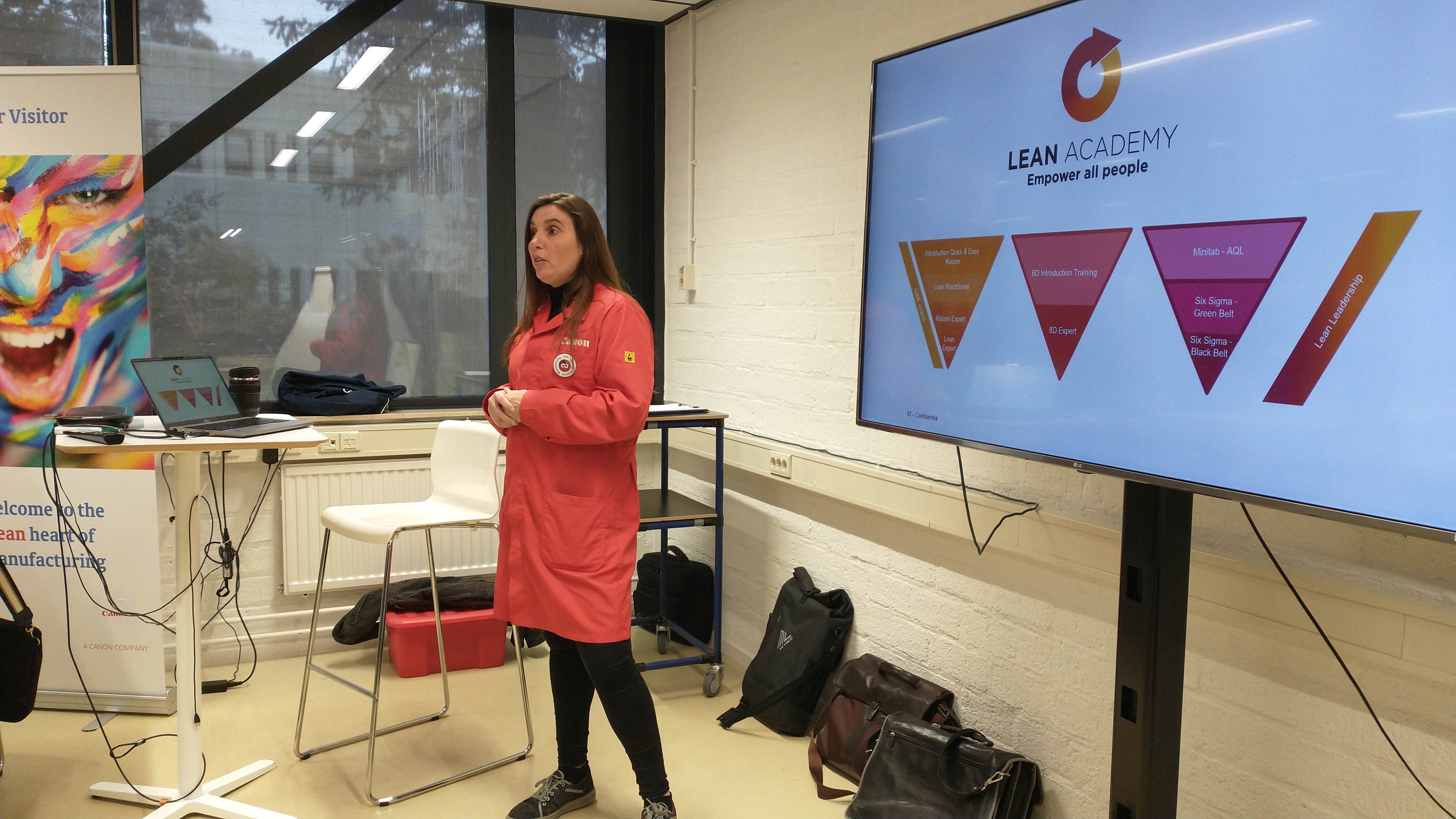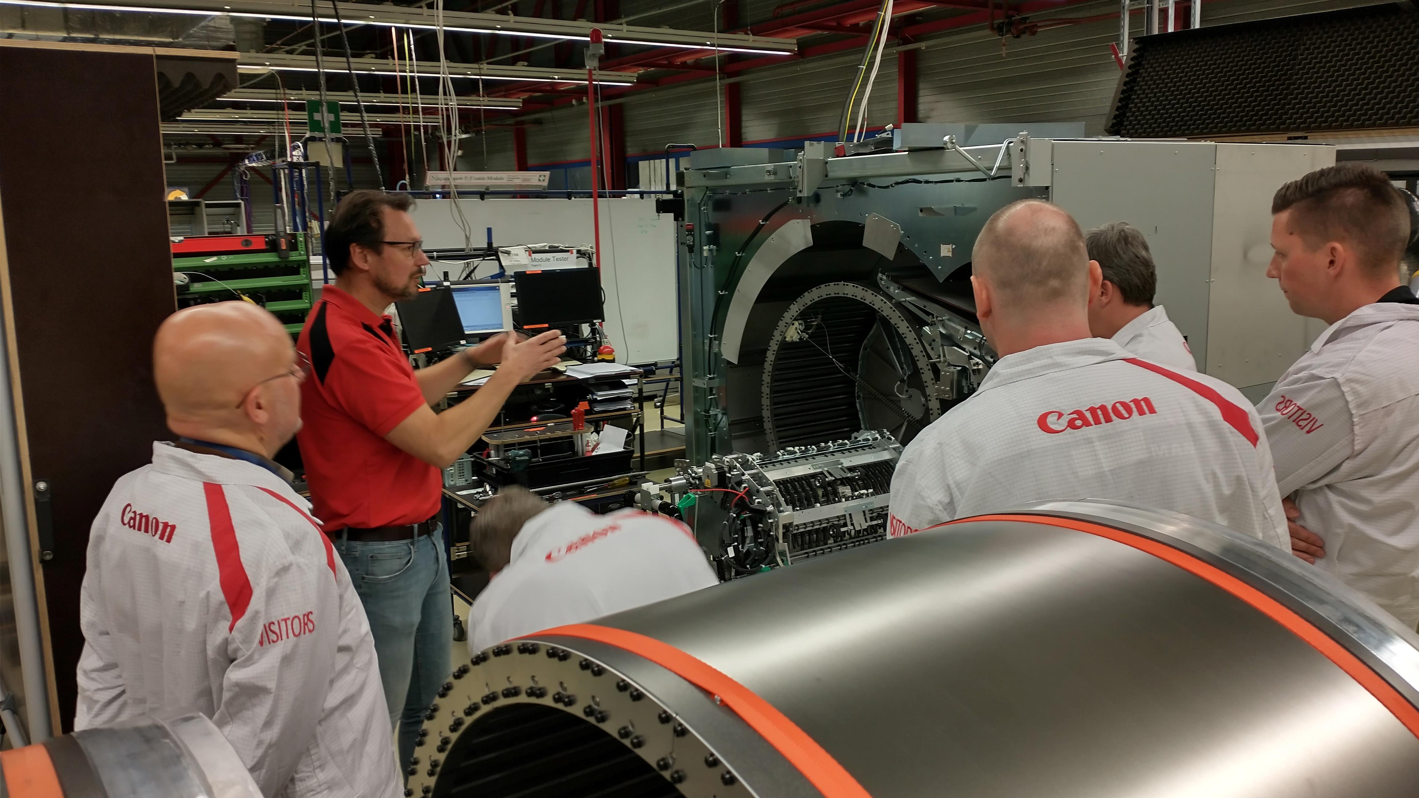 Tijdens het uiterst interactieve bedrijfsbezoek aan Canon Production Printing hebben we mogen ervaren hoe ze bij Canon omgaan met het thema Lean Manufacturing. Hun ‘Daily Management System’ (DMS) zorgt ervoor dat elke dag om stipt kwart over tien de status van de complete productie, van werkvloer tot directie, in kaart is gebracht en eventueel bijgestuurd kan worden bij onregelmatigheden. Canon hanteert al vanaf 2009 de ‘lean productie filosofie’. Onze gastheer Mark Lichteveld (Manufacturing Manager) en zijn collega’s, hebben ons laten zien welke stappen sindsdien zijn gezet en hoe de overgang van Océ naar Canon een en ander in een stroomversnelling heeft gebracht. Alle medewerkers worden betrokken en uitgedaagd om verspilling uit de keten te halen waarbij gefocust wordt op waardecreatie voor medewerkers, omgeving en de klant. De eigen Lean Academy, die in- en externe LEAN-opleidingen verzorgt, borgt dit gedachtegoed voor de lange termijn.